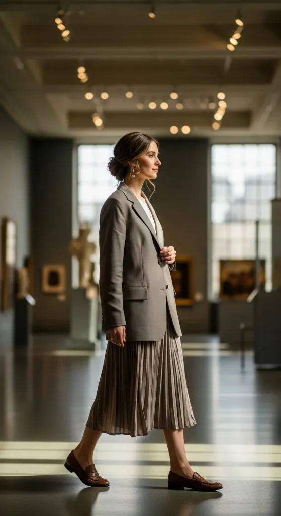 A relaxed blazer over a pleated midi skirt blends structure and movement beautifully. It feels artistic, elegant, and confident, perfect for women who love balance in their style.