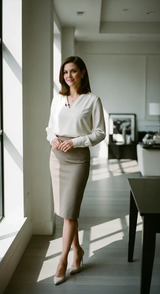 Stylist Suggestion: Choose a blouse with a gentle neckline and skip heavy necklaces. Let the fabric’s natural sheen be the statement instead.