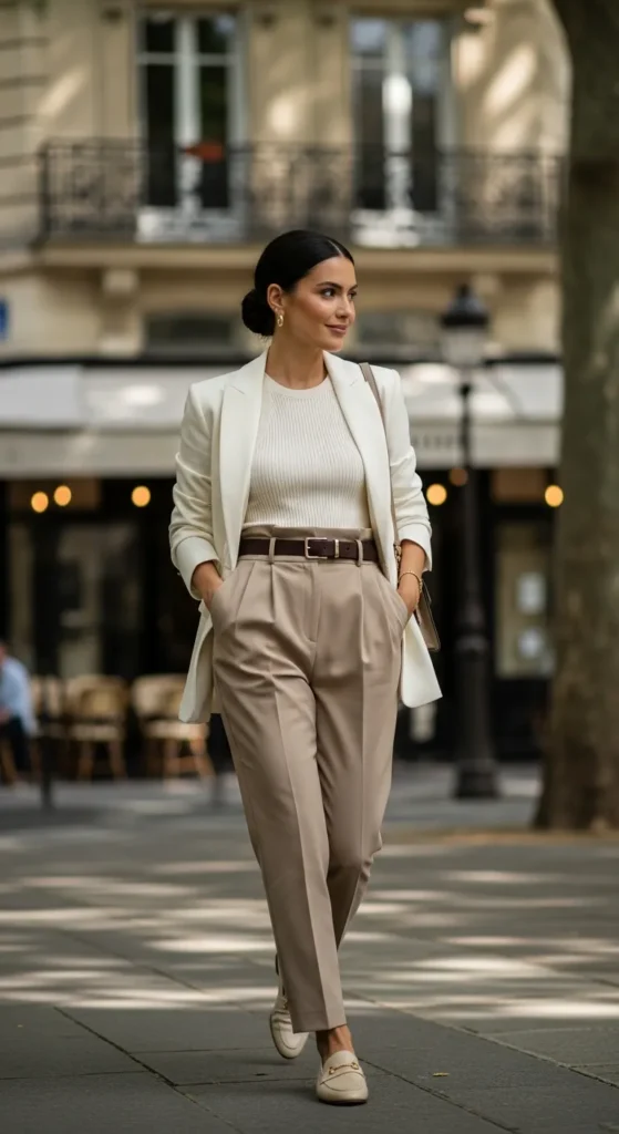 A structured ivory blazer layered over a fine ribbed knit tank and straight-leg trousers creates effortless polish without stiffness. It feels calm, confident, and refined, like a woman who knows exactly who she is.