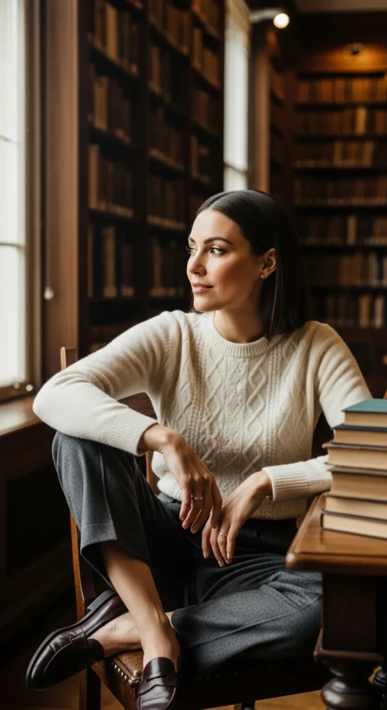 Stylist Suggestion: Choose a sweater slightly tucked at the front. This keeps the proportions flattering and prevents the outfit from looking too formal or heavy.