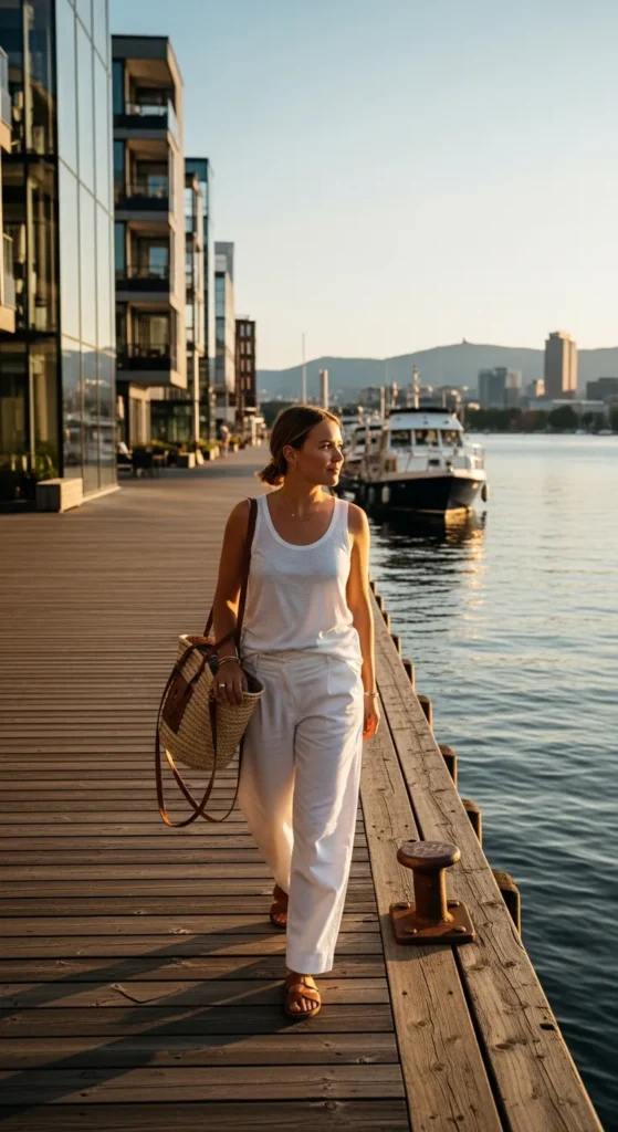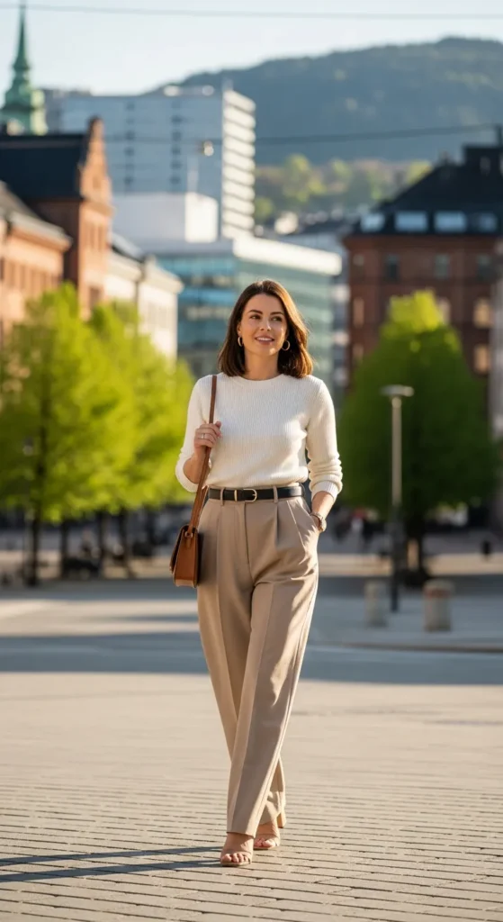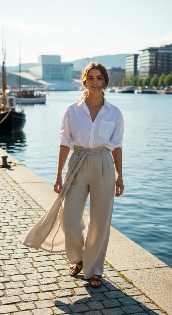 A crisp white shirt paired with relaxed linen trousers feels breathable and fresh during Oslo summers. It’s airy but refined, perfect for slow afternoons by the fjord.