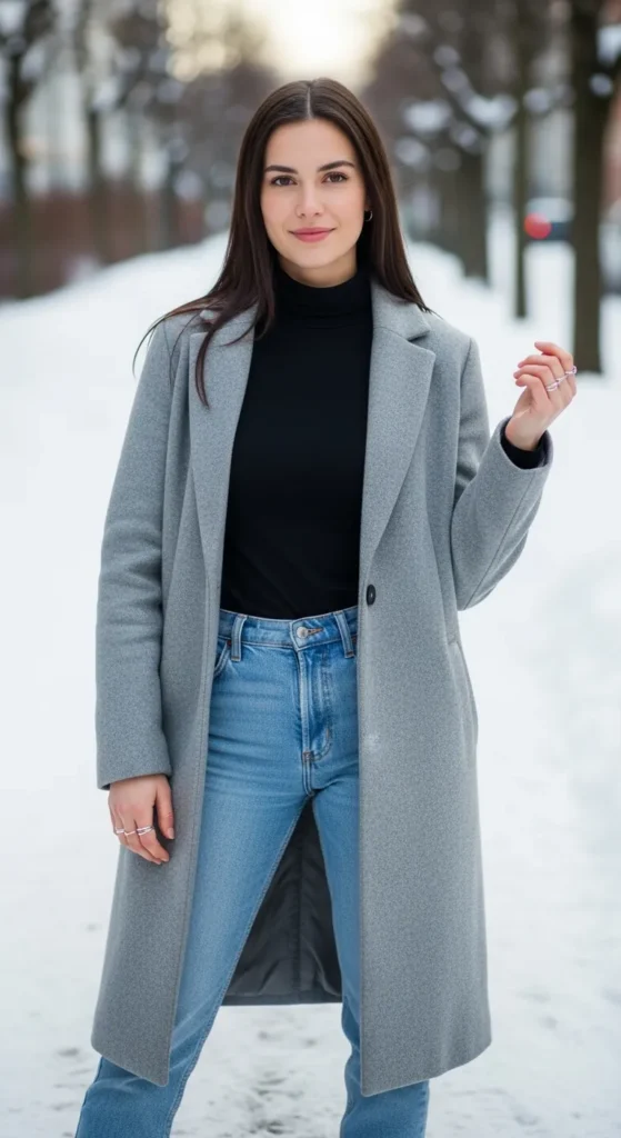 A fitted black turtleneck and relaxed light-wash denim is a Scandinavian staple. It’s clean, flattering, and timeless, ideal for layering under coats in cooler months.