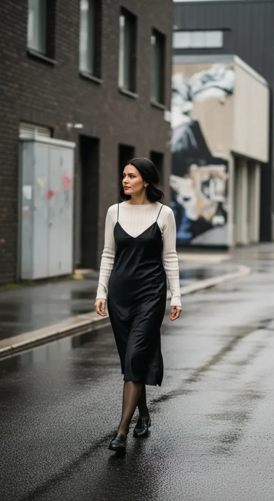 A black slip dress layered over a thin knit top gives subtle contrast and depth. It feels creative but still minimal.