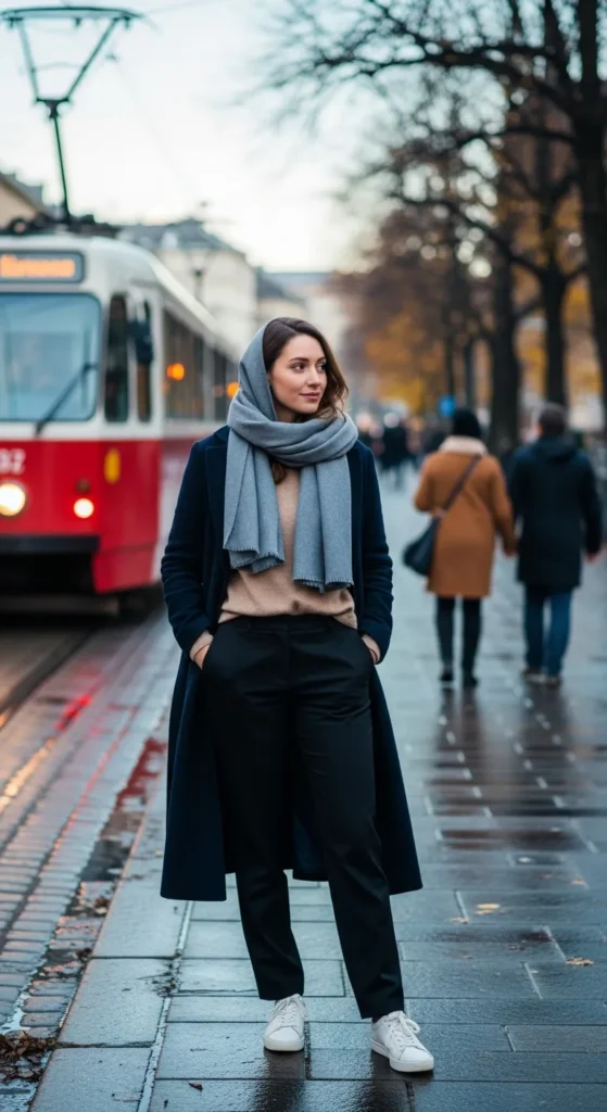 Stylist Suggestion: Let the scarf drape loosely instead of tightly wrapping it. The relaxed drape feels more Scandinavian and less formal.