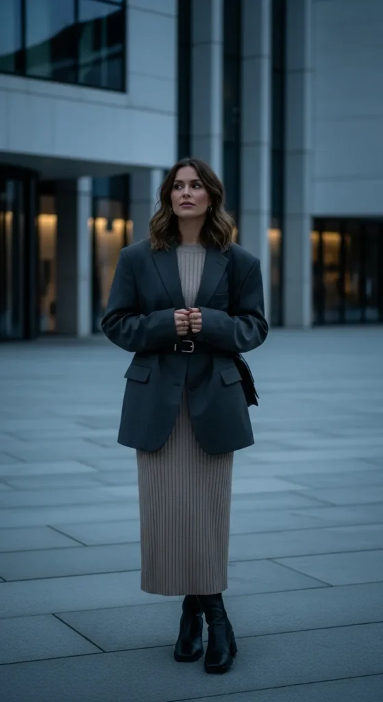 An oversized charcoal blazer over a fitted ribbed midi dress feels modern and quietly powerful. It hugs in the right places but stays sophisticated, perfect for gallery visits or evening dinners.