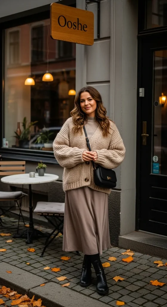 A chunky neutral cardigan over a flowy midi skirt feels romantic yet grounded. It’s ideal for coffee dates during cool afternoons.