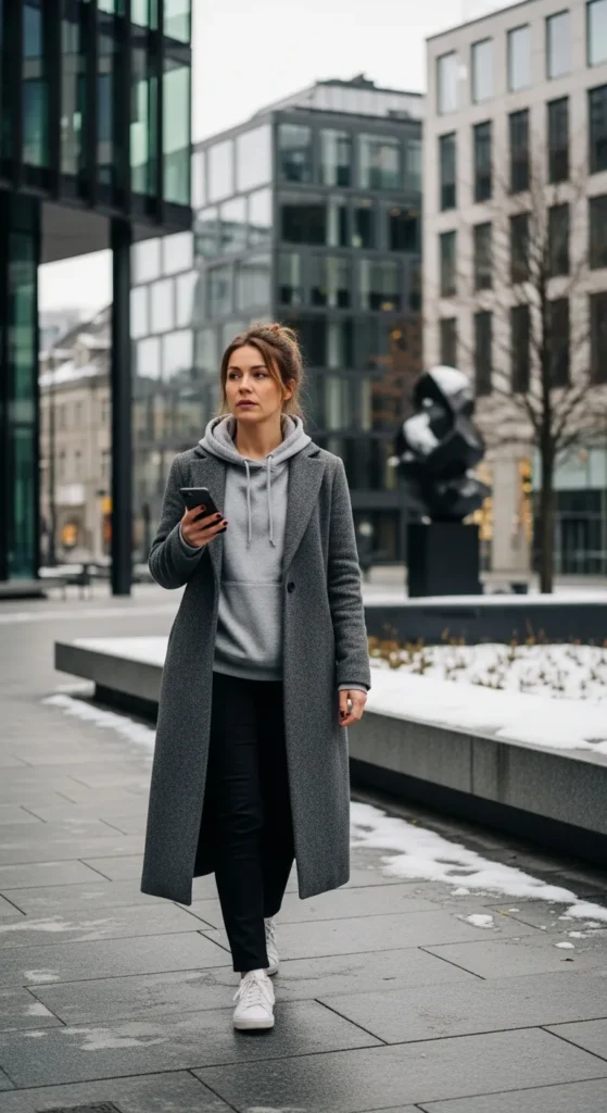 A soft grey hoodie layered under a structured coat blends comfort and polish effortlessly. It’s that cool off-duty Oslo energy.