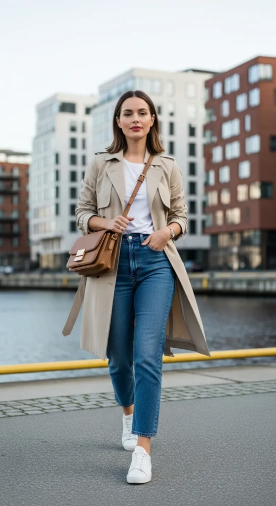 A lightweight beige trench layered over a white cotton tee and high-rise straight jeans feels effortlessly Oslo. The look is clean, structured, and quietly confident — perfect for harbor walks or slow café mornings.