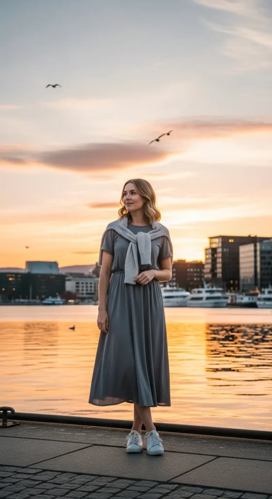 A simple grey midi dress styled with clean sneakers feels effortless and modern.