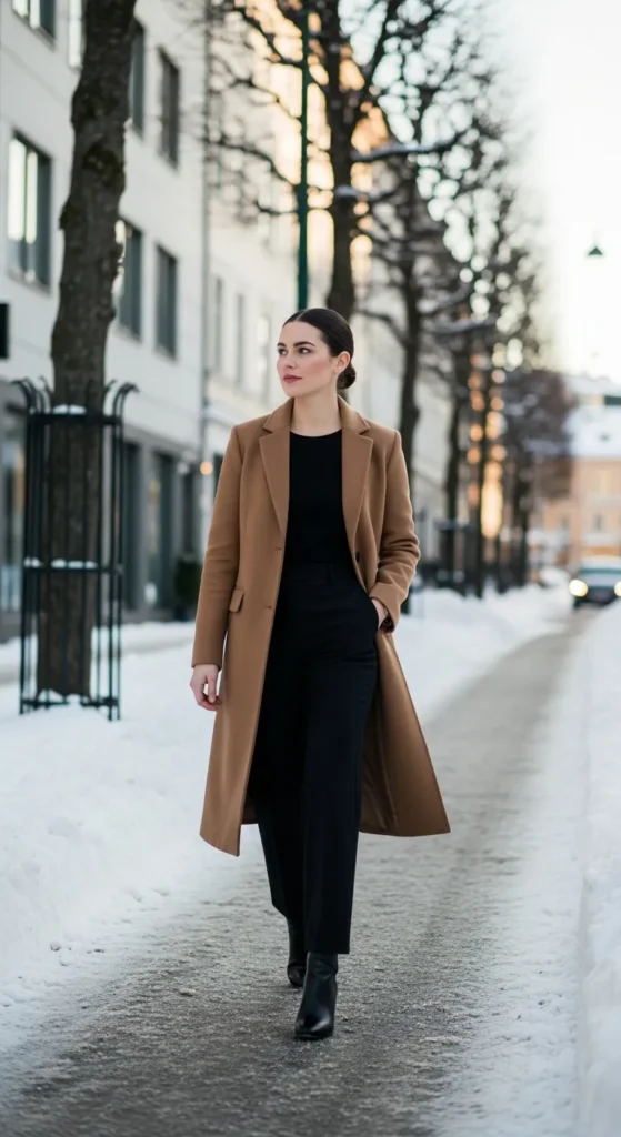A camel coat over an all-black base outfit feels classic yet modern. The contrast highlights clean lines and keeps everything sleek.