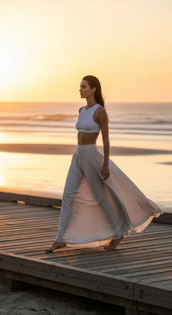 A minimal crop top paired with a high-waist maxi skirt elongates the lower body while keeping the waist defined. The flowing skirt adds movement, making this a graceful and slimming casual summer choice.
