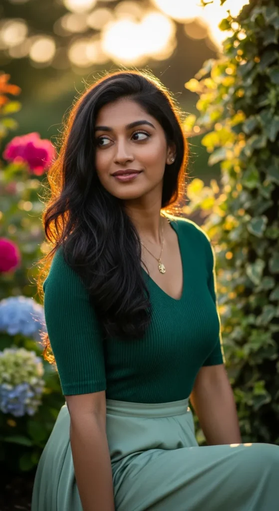 A V-neck ribbed top paired with a flowy midi skirt elongates the neck and creates vertical flow through the body. This feminine pairing feels soft, flattering, and ideal for both casual and slightly dressy occasions.