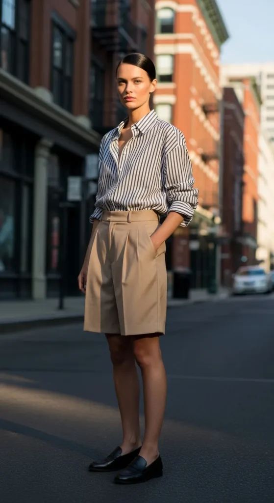 Vertical stripes create a lengthening effect, especially when paired with high-waisted tailored shorts. This combination feels crisp and structured, perfect for summer days when you want effortless style and a more streamlined appearance.