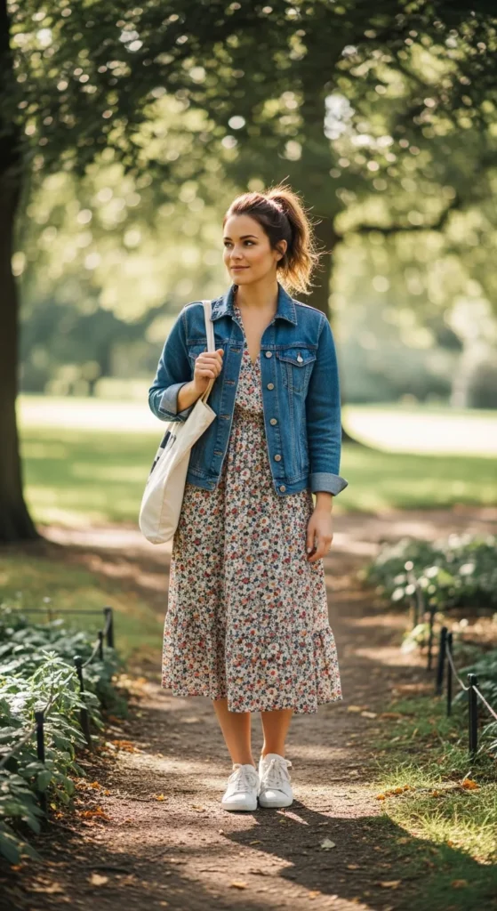 A denim jacket layered over a flowy midi dress adds structure on top while the dress gently conceals the midsection. This mix creates a casual yet put-together outfit that feels youthful and easygoing.