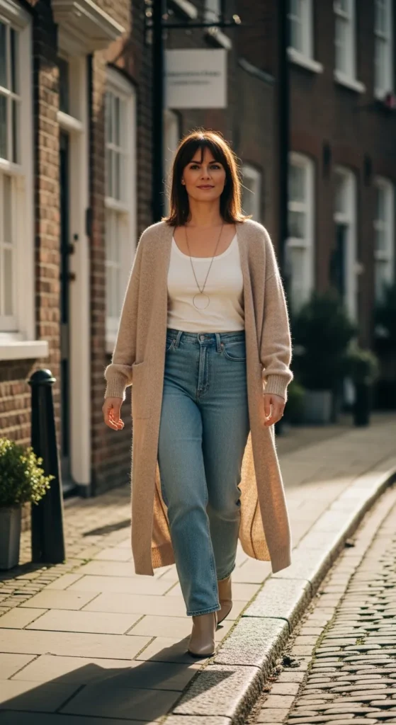 A longline cardigan creates vertical flow that naturally slims the body while layering over a simple tank and jeans. The open front draws the eye downward, making the midsection feel less defined while keeping the outfit cozy and effortless.