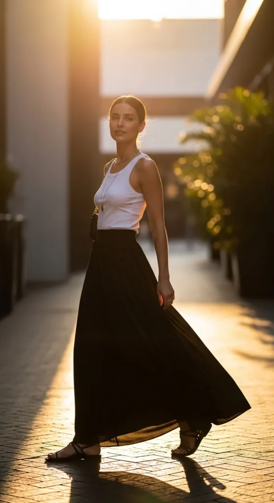 A flowing maxi skirt paired with a fitted tank top creates contrast between structure and movement. The skirt gently hides the belly area while the top defines the upper body for a balanced and graceful appearance.