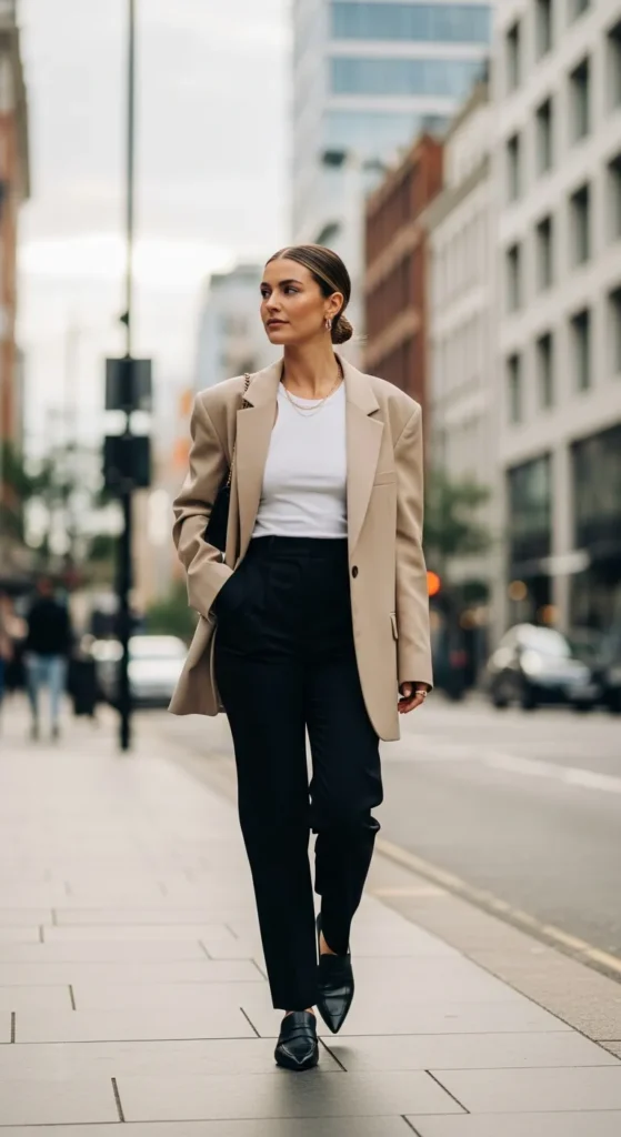 An oversized blazer layered over straight-leg pants creates a structured outer frame that doesn’t cling to the midsection. The vertical lines elongate the body while keeping everything sharp, modern, and effortlessly powerful without feeling restrictive or uncomfortable.
