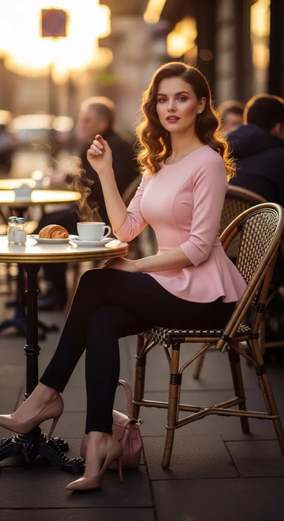 A peplum top gently flares from the waist, subtly concealing the belly while enhancing curves in a flattering way. Paired with skinny jeans, it creates a balanced silhouette that feels feminine, structured, and perfect for casual outings or dinner plans.