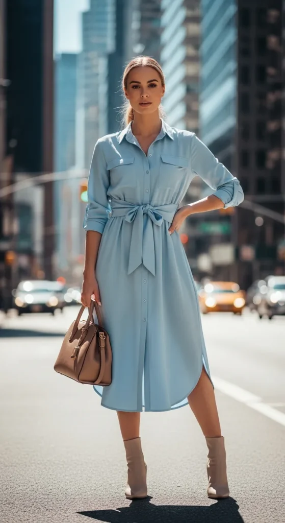 A shirt dress with a waist tie allows adjustable shaping, giving control over how fitted or relaxed you want it. The structured collar adds polish while the fabric drapes gently over the midsection for a clean, confident look.