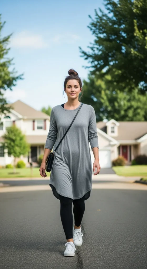 A long tunic top offers extended coverage while skimming over the belly area without clinging. Paired with slim leggings, it creates a streamlined bottom that balances the flowy upper half, making it a perfect everyday comfort outfit.