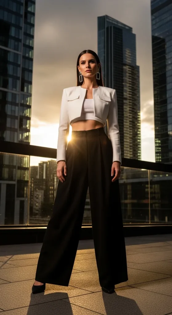Wide-leg pants naturally flow away from the body, while a cropped jacket ends above the midsection, drawing attention upward. This contrast creates a balanced proportion that feels modern, bold, and flattering for many body types.