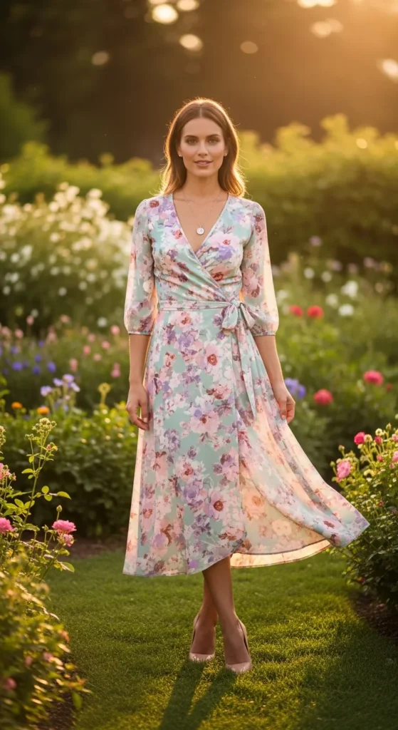 A wrap dress naturally cinches at the smallest part of the waist while softly draping over the belly area. Soft prints add visual movement, making the silhouette feel light and forgiving while still maintaining a graceful feminine shape perfect for brunch or evening walks.