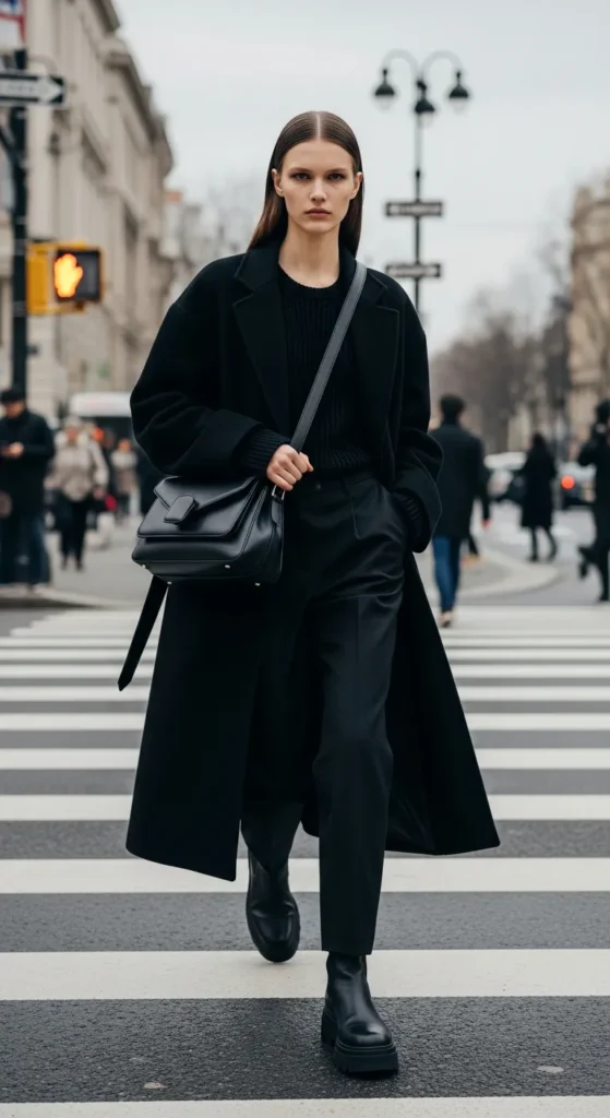 A relaxed black oversized coat with matching separates creates a bold winter silhouette that feels strong, modern, and effortlessly cool, perfect for days when confidence is your main accessory.
