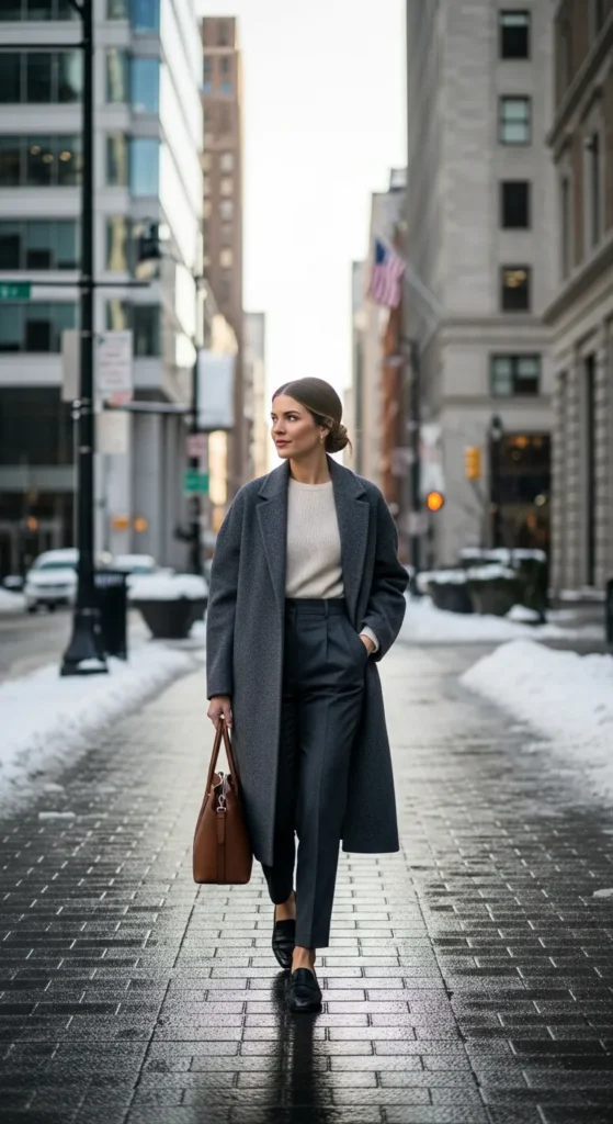 This oversized coat paired with tailored pants and a simple top creates an easy work-friendly winter look that feels relaxed yet professional without looking overly formal.