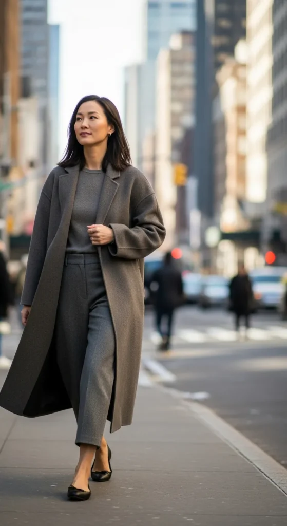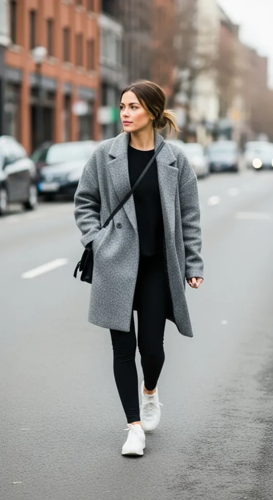 An oversized gray coat paired with leggings and a fitted top gives you movement and comfort while still looking elevated, ideal for busy winter days that demand both function and style.