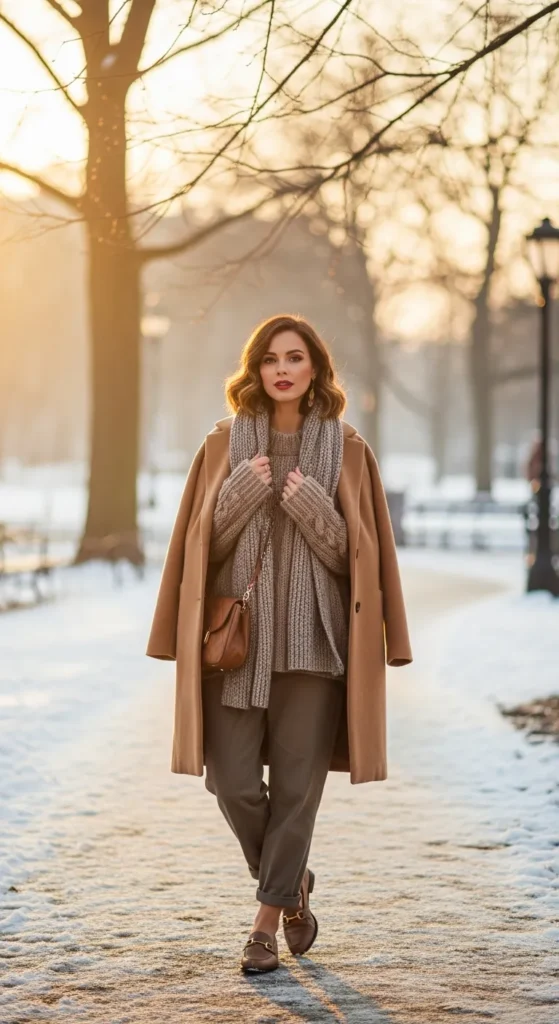 This look combines an oversized camel coat with a chunky knit and relaxed pants, creating warmth without bulk and a soft winter vibe that feels comforting yet stylishly put together.