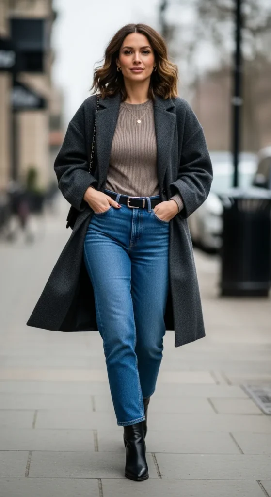 An oversized charcoal coat layered over classic blue jeans and a ribbed top delivers that effortless off-duty energy, blending structure with comfort for everyday winter moments without sacrificing personal style.