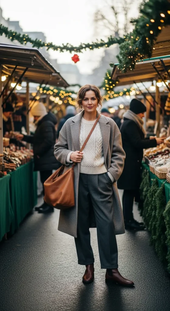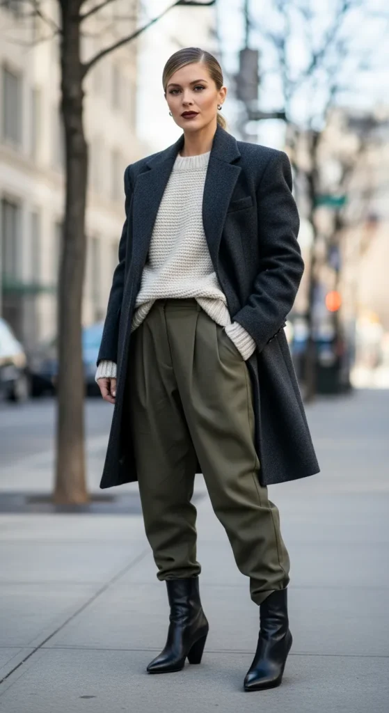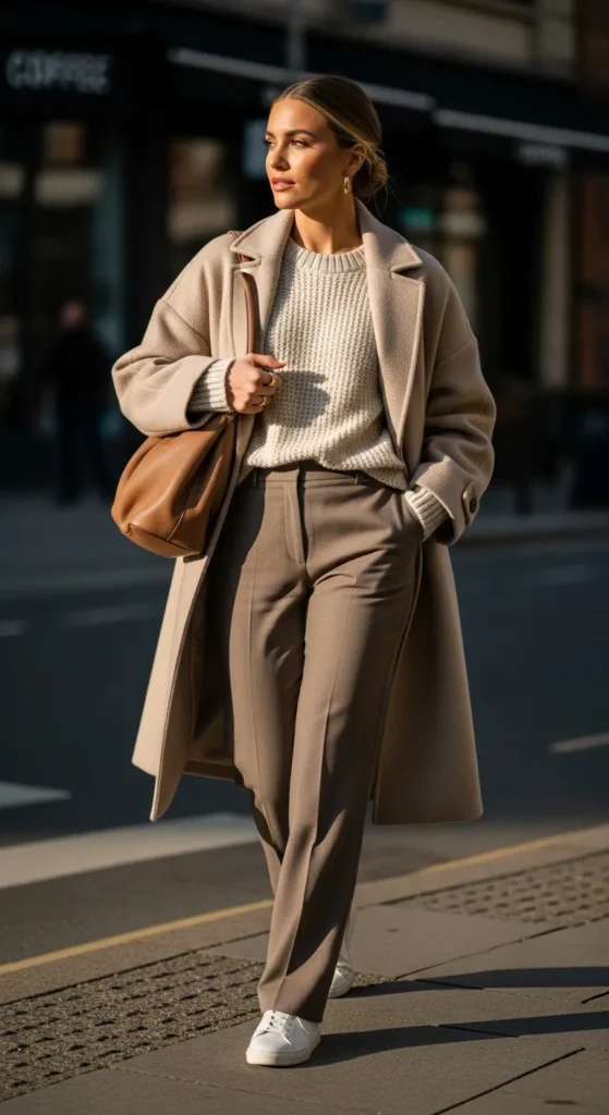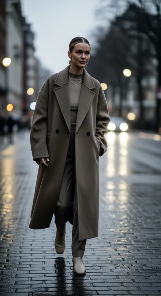 A structured oversized coat balanced with soft fabrics underneath creates a look that feels refined yet approachable, perfect for everyday winter dressing with subtle sophistication.