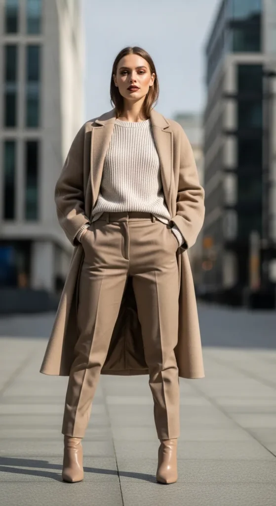 Layering different beige tones under an oversized coat creates a calm, fashion-forward winter outfit that feels warm, intentional, and quietly luxurious without being flashy or impractical.