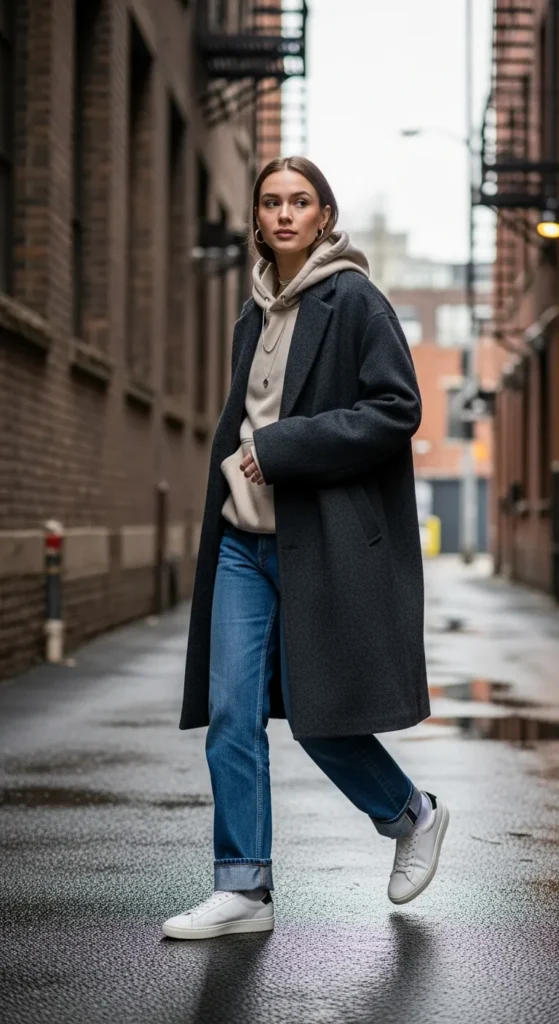 Pairing an oversized coat with a hoodie underneath brings a relaxed street-style energy, blending comfort and trend for cold days when you still want to feel styled, not bundled.