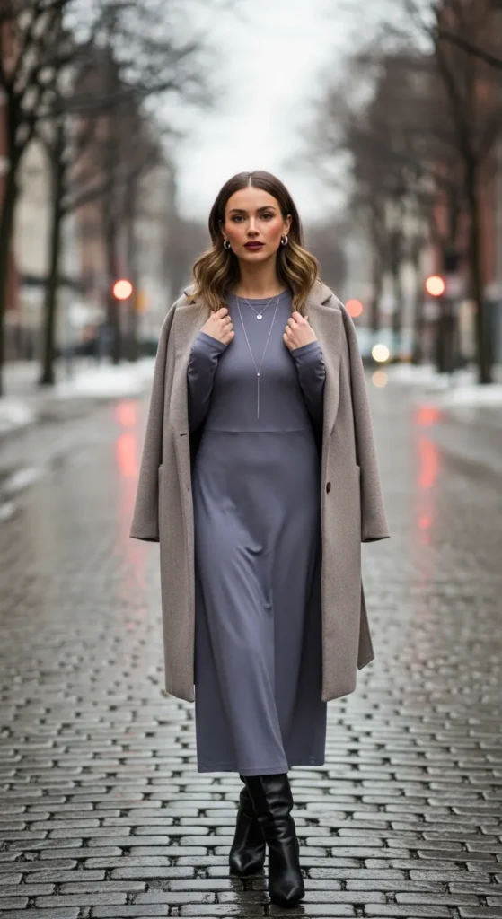 Layering an oversized coat over a winter-friendly midi dress brings feminine flow to cold-weather styling, offering warmth while still feeling graceful and wearable.