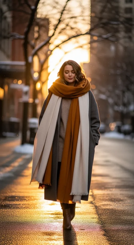 Letting a statement scarf lead the outfit under an oversized coat adds warmth and personality, turning a simple winter look into something expressive and cozy.