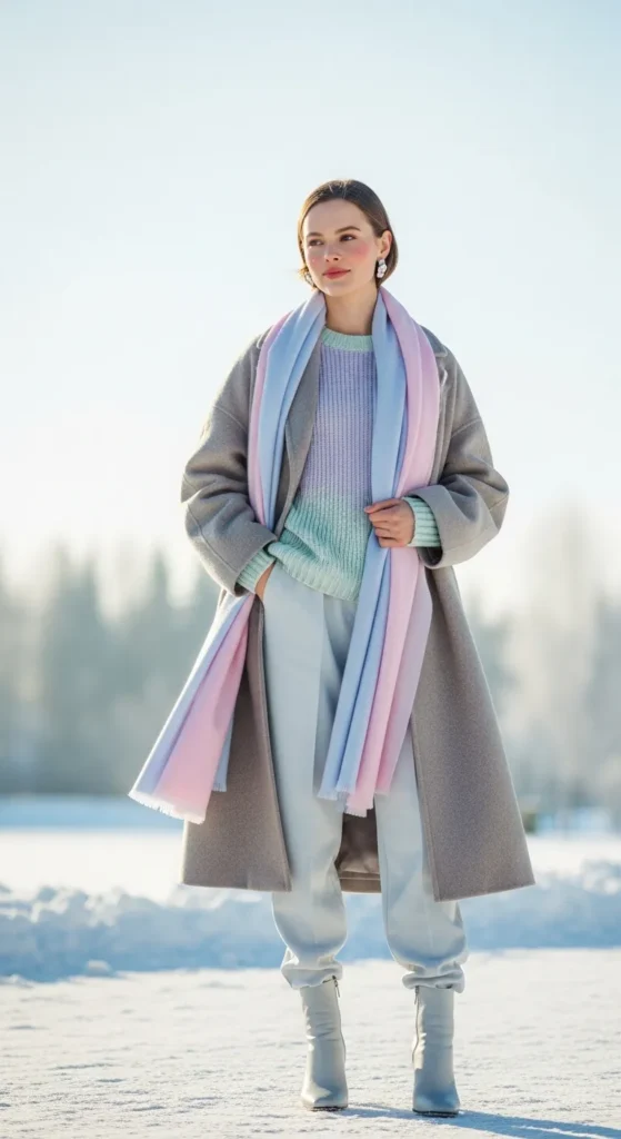 Soft pastel layers under a neutral oversized coat bring subtle color into winter dressing, keeping the look fresh, feminine, and wearable without feeling seasonal or forced.