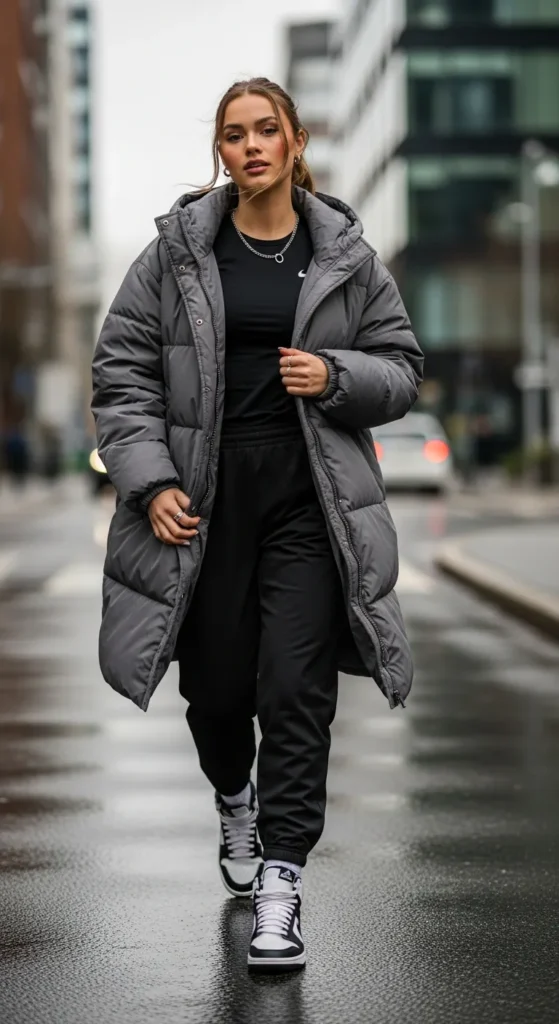 An oversized coat styled with relaxed joggers and a fitted inner layer blends sporty comfort with winter trends, creating a balanced look that feels modern and effortless.