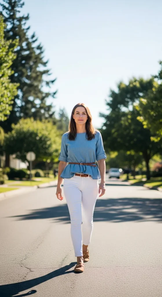 A chambray peplum top paired with white skinny jeans creates a crisp contrast while keeping everything relaxed and wearable. It’s ideal for casual lunches or daytime errands.