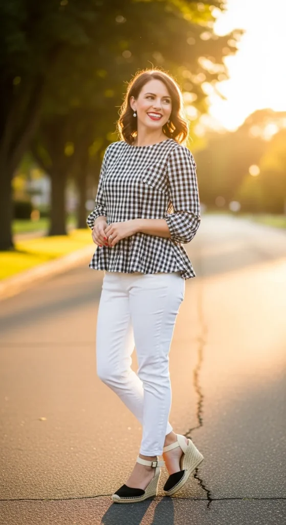 A gingham peplum top styled with white mom jeans feels charming and slightly retro. The checkered pattern adds personality while the white denim keeps everything crisp and summer-ready.