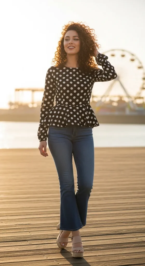A polka dot peplum top combined with cropped flare jeans feels playful with a touch of retro flair. The slight flare at the hem elongates the legs beautifully.