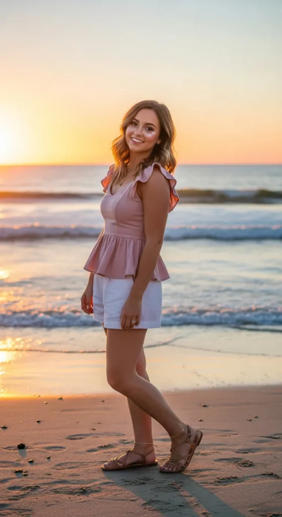 A ruffled peplum top styled with white linen shorts feels light, breezy, and slightly romantic. The movement of the ruffles adds dimension under bright sunshine.