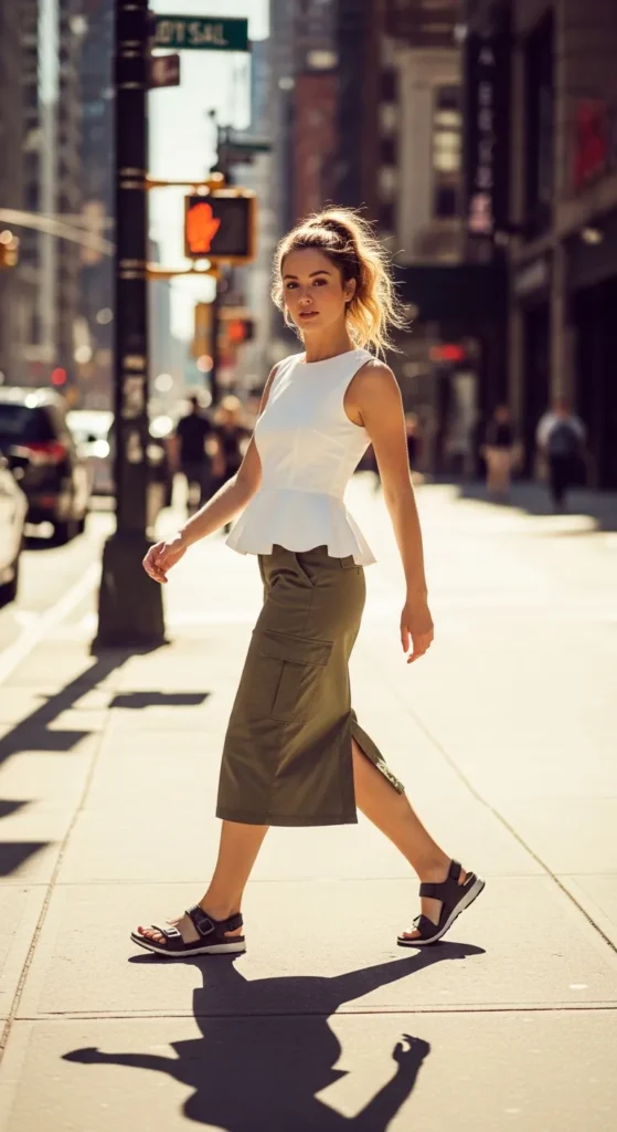 A sleeveless peplum top paired with a casual cargo midi skirt blends femininity with utility. It’s modern, comfortable, and ideal for busy sunny days.