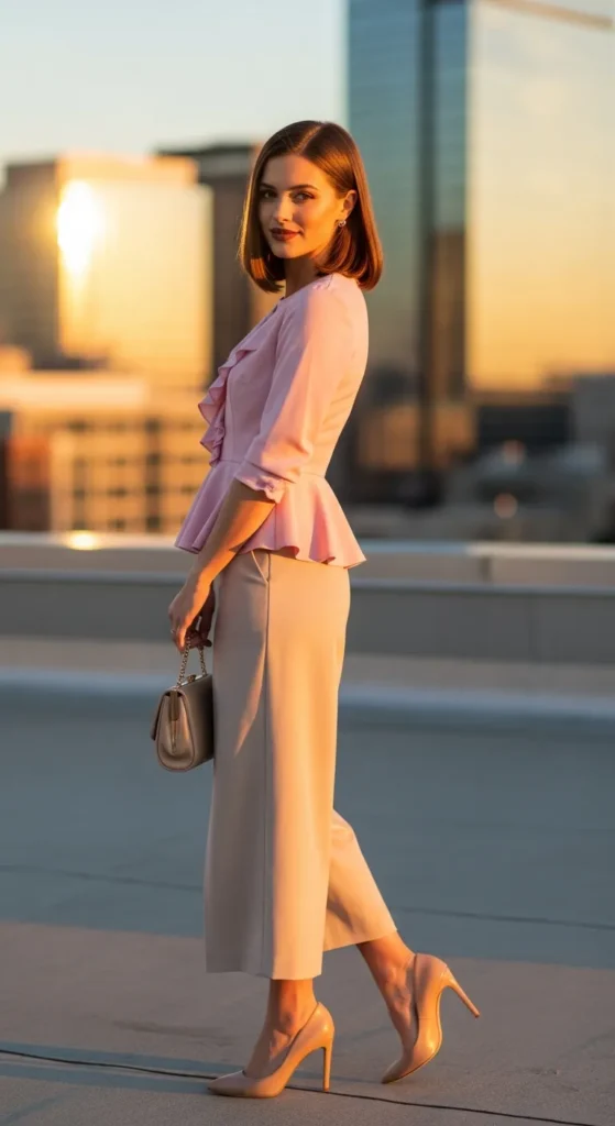 A soft pink peplum top with flowy beige culottes feels gentle and sophisticated. The airy fabric combination keeps you cool while looking put together.