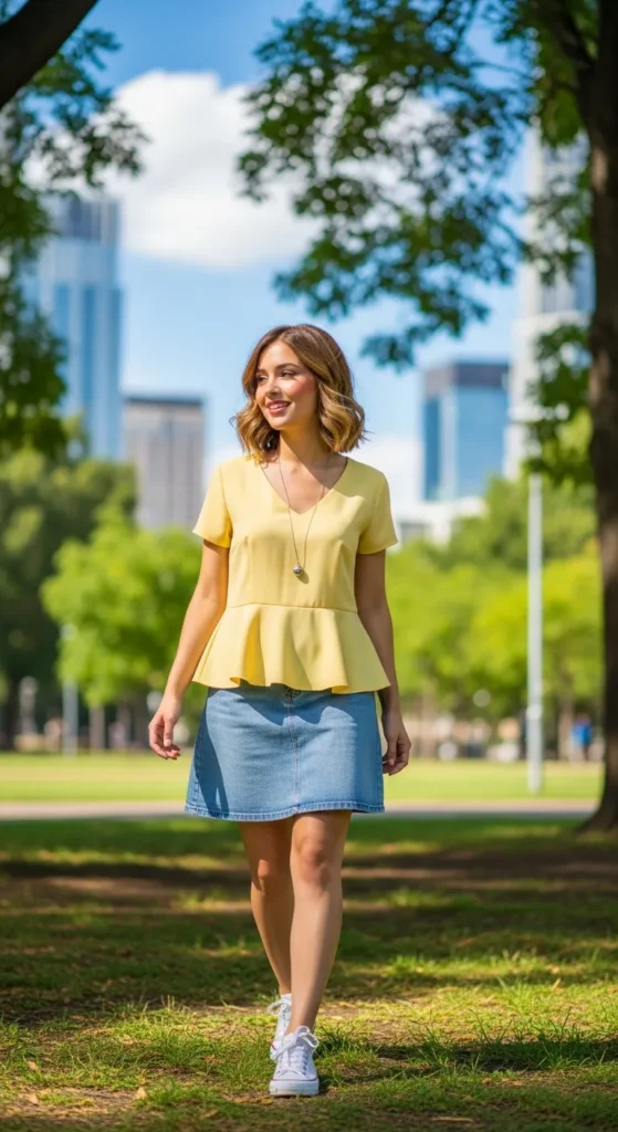 A soft yellow peplum top paired with a light denim skirt radiates sunshine energy. The color combination feels optimistic and fresh for daytime adventures.