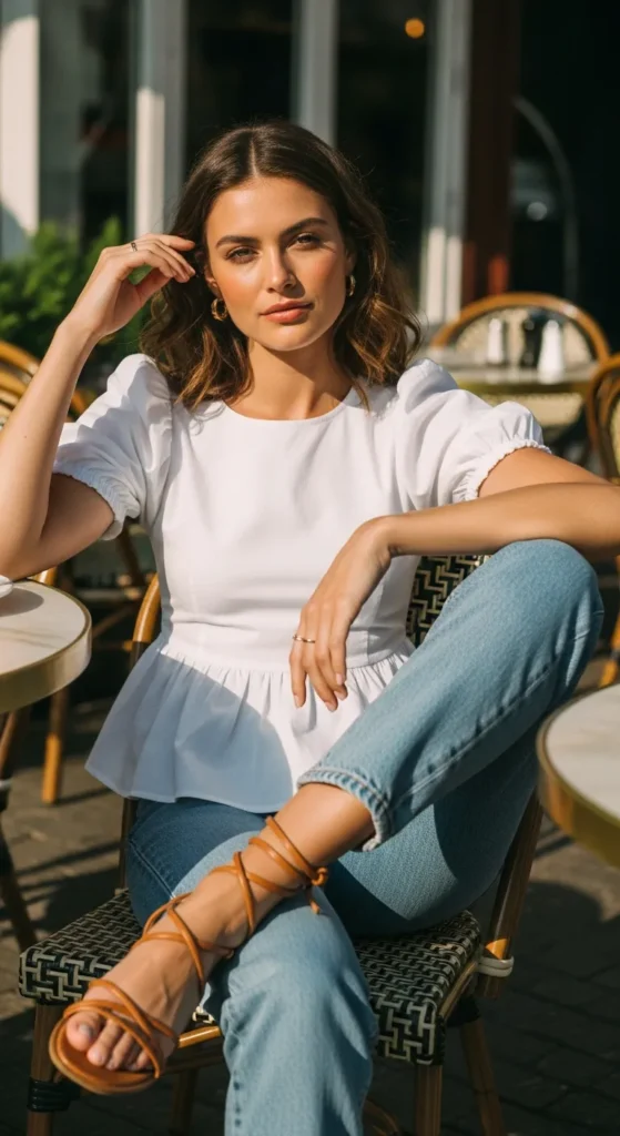 A crisp white cotton peplum top paired with light wash straight-leg jeans feels clean, fresh, and timeless. The soft flare at the waist balances the structured denim, creating an easy daytime look perfect for brunch or a sunny city walk.