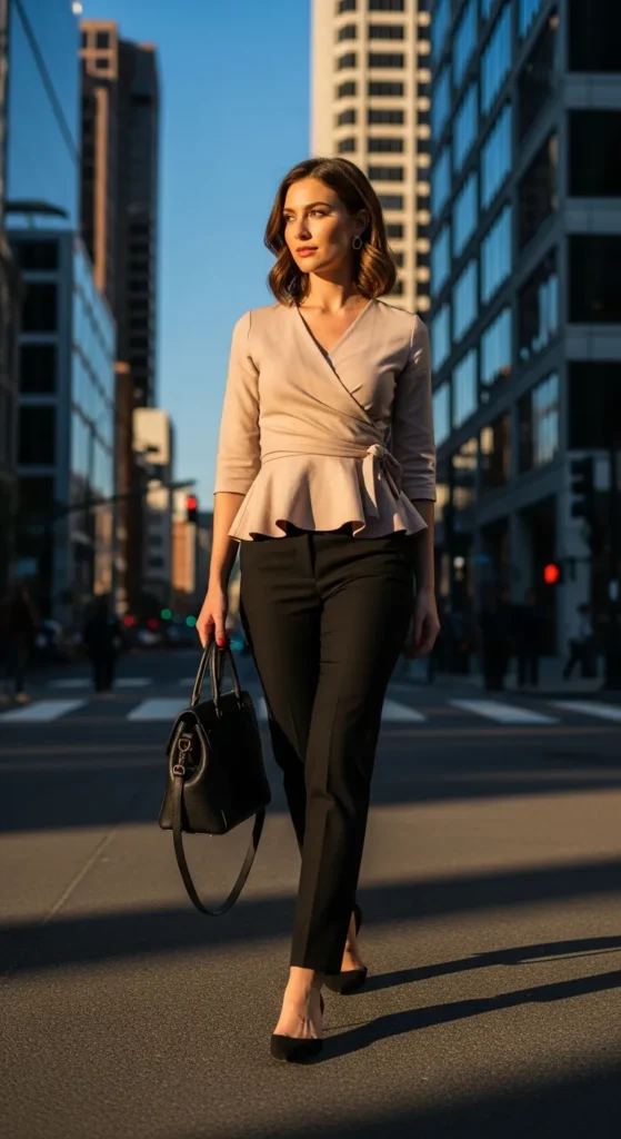 A wrap-style peplum top with straight black pants creates a flattering hourglass shape while staying refined. It transitions easily from daytime meetings to evening plans.