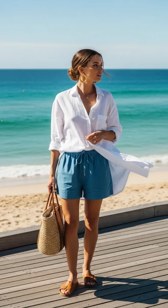 A crisp white linen shirt tucked loosely into ocean-blue cotton shorts feels effortlessly coastal. The airy fabrics move gently in the sea breeze while the clean palette reflects Perth’s bright sunshine and relaxed seaside rhythm.