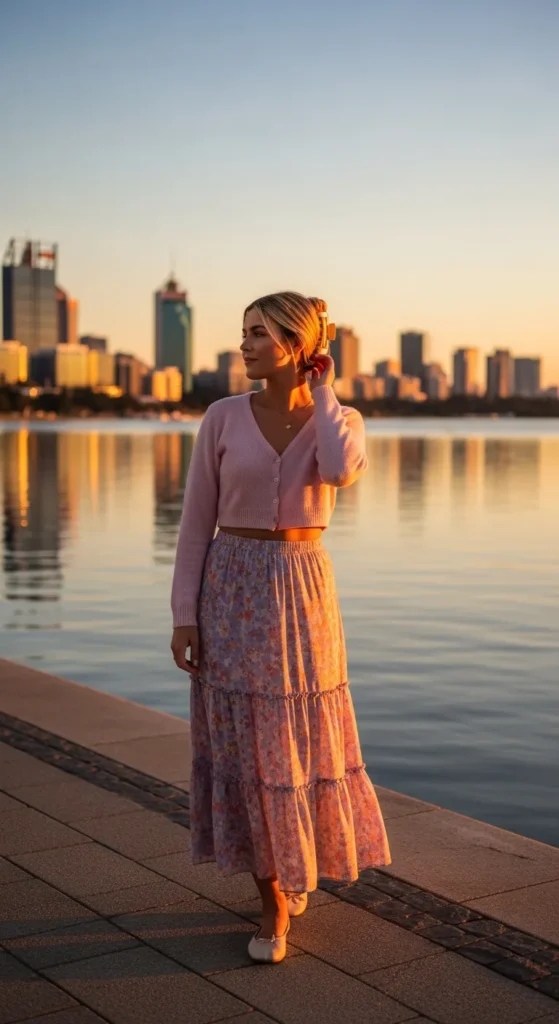 A lightweight cropped cardigan layered over a breezy skirt works well when coastal winds pick up in the evening. It feels soft, feminine, and slightly vintage inspired.