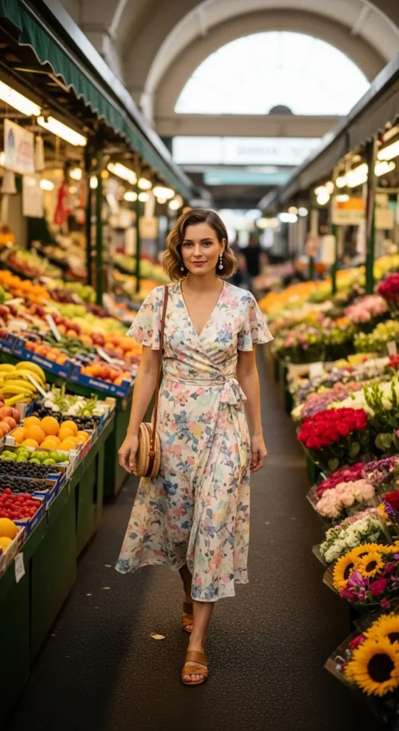 A breezy floral wrap dress feels perfect for exploring local farmers markets. Soft pastel florals echo Perth’s spring blossoms while the wrap style flatters the waist and moves gracefully with each step.